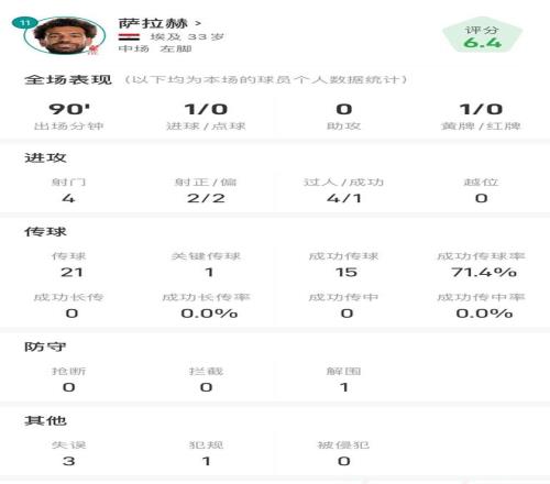 萨拉赫本场数据: