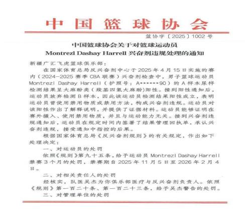 中国篮球协会发布通知,在2024-2025赛季CBA联赛赛内兴奋剂检查中,前新疆男篮运动员哈雷尔的A样本检测呈大麻酚类阳性,且其放弃检测B样本,违规成立。依据相关规定,给予该运动员禁赛3个月(2025年11月5日至2026年2月4日)的处罚;给予俱乐部医疗与反兴奋剂负责人吴杰警告处罚;给予新疆男篮警告,并令其承担20例兴奋剂检测费用36000元。同时明确了禁赛期相关限制及费用缴纳等其他事项。