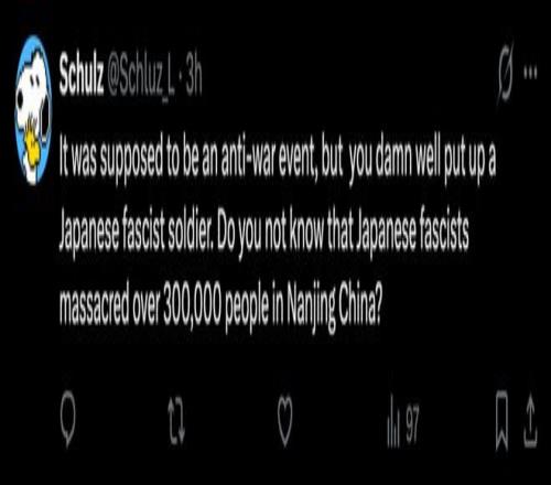 “这个比赛本该反对战争,但你们却放出一张日本法西斯军官的照片。你们难道不知道日本法西斯在中国南京屠杀了至少30万平民吗?”