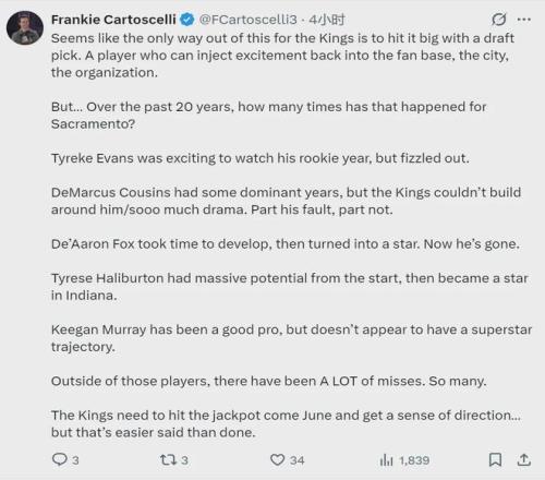 国王105-136狂输掘金31分,赛后国王记者Frankie Cartoscelli写道:“国王唯一的出路就是通过选秀找到一位巨星,能够重新点燃球迷热情和球队士气。说起来容易做起来难,回顾过去20年选秀,国王又有多少次实现这种愿望呢?”