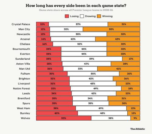 利物浦本赛季有32%的英超比赛时间处于落后追赶状态,是曼城或阿森纳所占时间比例的两倍多。正如斯洛特指出的,这改变了他们的战术打法。