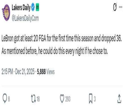 面对詹姆斯这样的表现,湖人媒体Lakers Daily称赞道:“詹姆斯本赛季首次出手20+就轰下36分,正如他此前自己所说,只要他愿意,他每晚依旧可以做到这一点。”