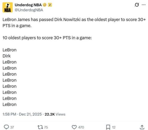 除此之外,40岁355天的詹姆斯超越40岁294天的诺维茨基,成为NBA历史上单场砍下30+得分年龄最大的球员。
