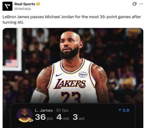 凭借这样的表现,詹姆斯40岁之后第4场轰下35+得分表现,成功超越篮球之神乔丹独占NBA历史第一。