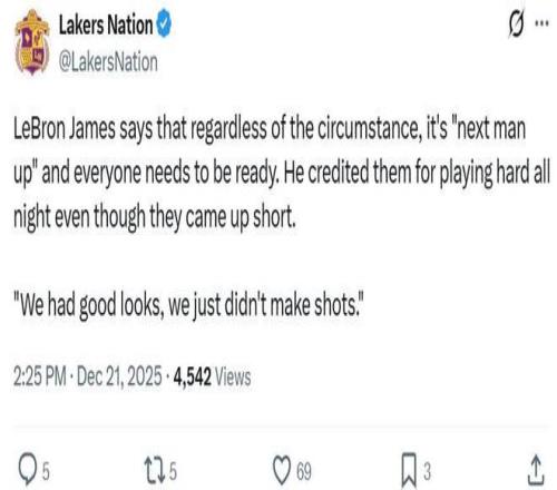 赛后詹姆斯也提及这一问题,直言:“无论发生什么情况,所有人都要有下一个顶上的心态,每个人随时都要做好准备,尽管没能取胜,但队友们足够努力,只是没能命中那些机会不错的投篮而已。”