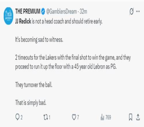 湖媒:雷迪克根本没有请求暂停,这才是我对湖人失去信心的原因之一。这场比赛真的糟透了。
