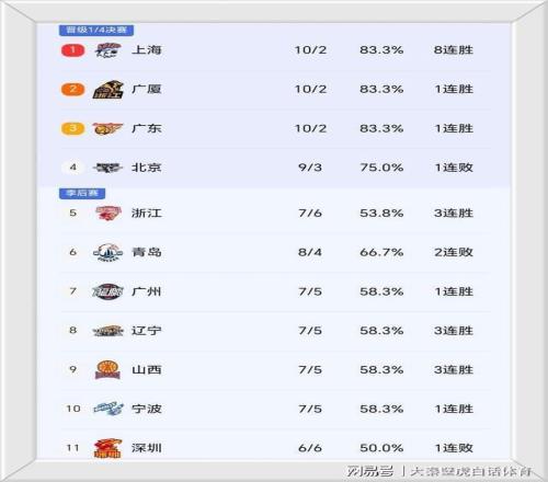 ③、榜首前三积分完全相同,分别是上海、广厦和广东队!